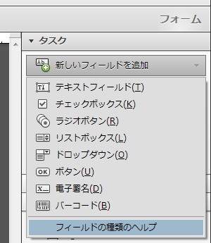 タスクパネルウィンドウの[新しいフィールドを追加]から、さまざまな種類のフィールドを文書に追加できます。Adobe Acrobat Standard * フォームエレメントについて