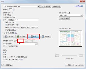 それには対象とする複数のページを選択した状態で、メニューから【ファイル → 印刷】を選択します。そして[ページサイズ処理]で[複数]を選択し、[1枚あたりのページ数]で、連結するページ数を指定します。そして[印刷]をクリックすると、連結された状態のPDFを作成できます。