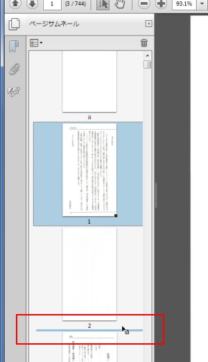 ページを移動する距離が長い場合には、多くのページが表示されるようにナビゲーションパネルの表示領域を広げるかサムネール画像を縮小しておくと、並べ替えの作業が楽になります。