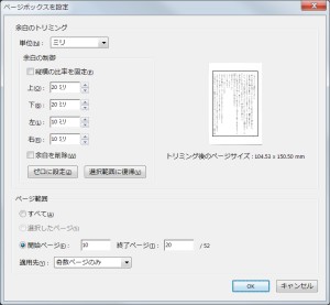 トリミングは、パネルウィンドウの【ツール → ページ → トリミング】から行えます。ドラッグで範囲を選択後、その範囲をダブルクリックすると次のダイアログが表示されます。