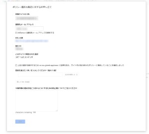 理由を確認後にその問題を解決したら、AdSenseへログインしポリシー違反の審査フォーム (Policy Violation Appeal)から審査を要求できます。