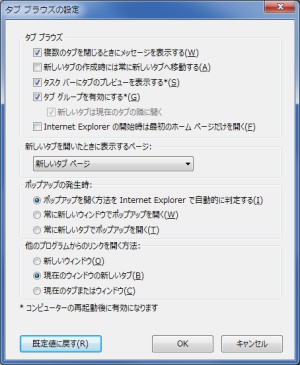 インターネット オプションの[全般]タブにある[タブ]ボタンをクリックすることで、タブの挙動を設定できます。